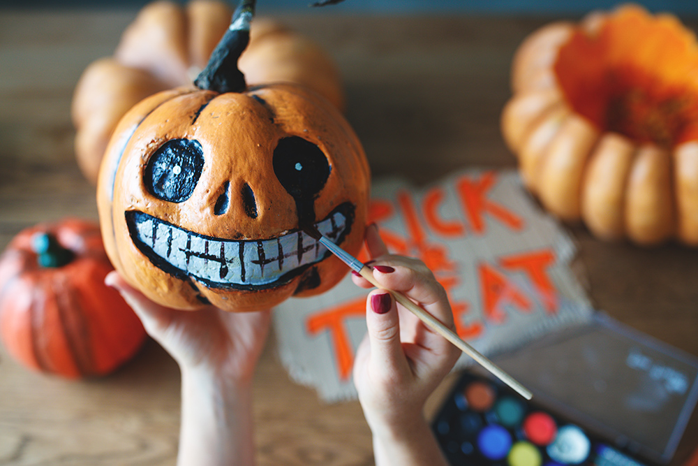 Eine ganz typische Deko-Idee für die Halloweenzeit ist es Kürbisse zu schnitzen. Probieren Sie etwas neues und bemalen Sie ihre Kürbisse – ein Spaß für die ganze Familie. So sind Ihre Kürbisse im Tageslicht und bei Abenddämmerung ein absoluter, leuchtender Hingucker.